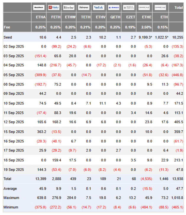 Other issuers experienced a more mixed week. Fidelity’s FETH product posted sharp redemptions, most notably $53.4 million in outflows on Friday, September 19. However, these outflows were partially balanced by $159.4 million in inflows on Thursday. Bitwise and Grayscale also witnessed days of inflows, which was enough to cancel out minor outflows during the week.